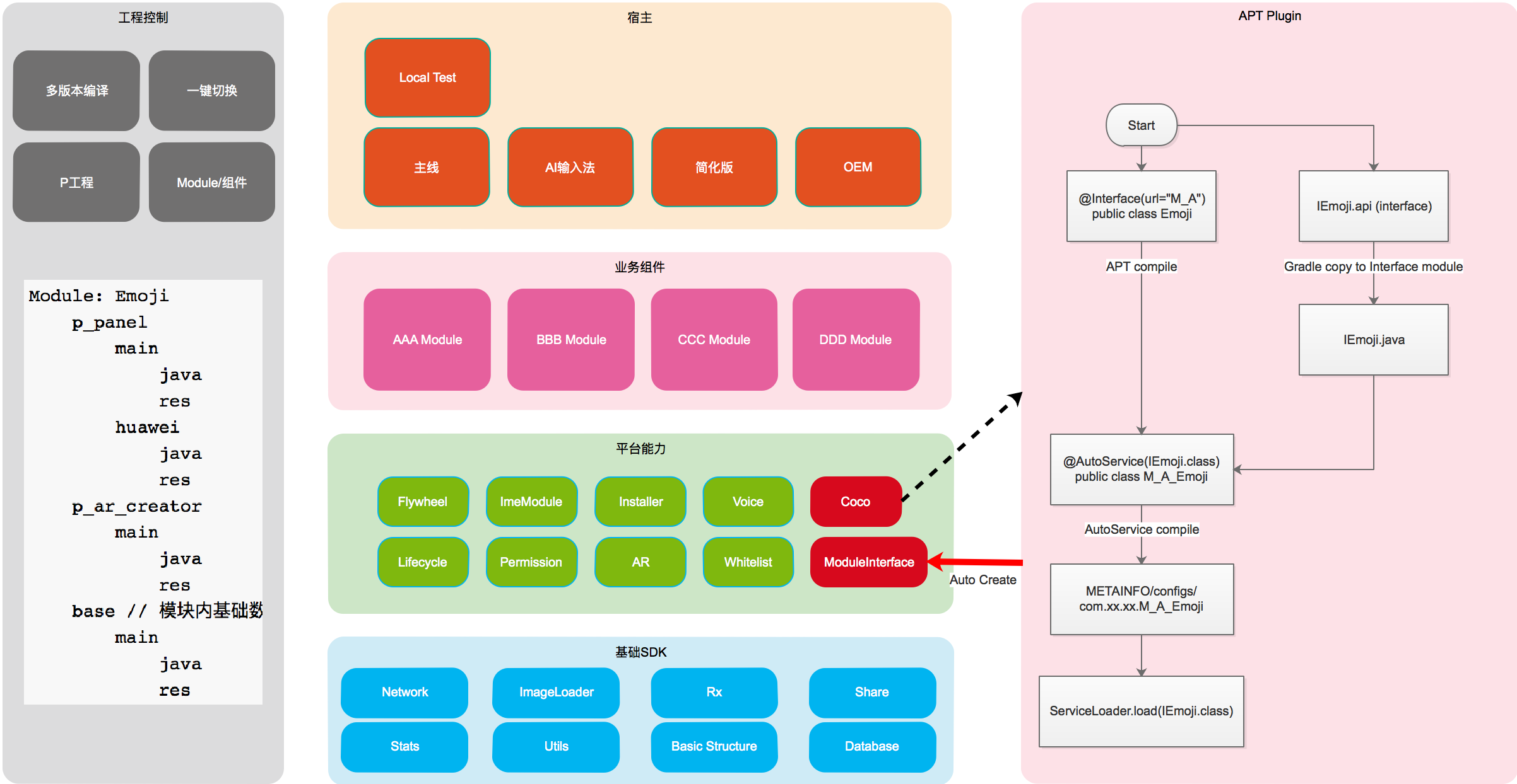 项目工程:输入法项目本身,4层架构,包括基础SDK,平台能力,业务组件,宿主