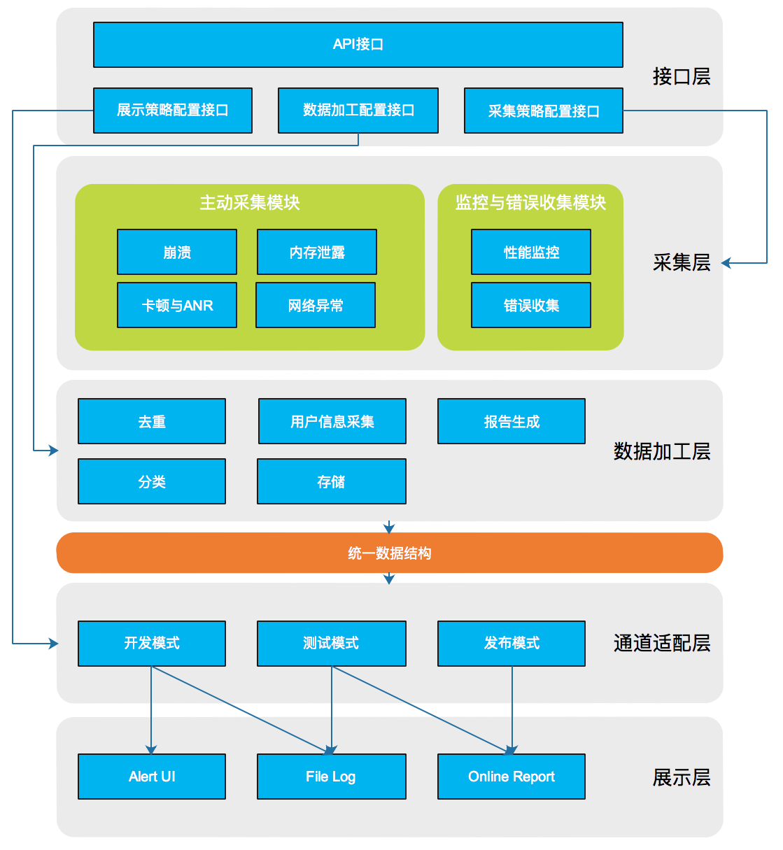 第一层为接口层,提供模块API调用,以及三类策略的配置接口。其中采集策略决定了模块如何进行采集,比如采集阈值、唤醒间隔等,数据加工策略决定了采集到数据后如何进行加工处理,比如去重、分类、过滤等,展示策略则决定了不同模式下如何展示给开发者。