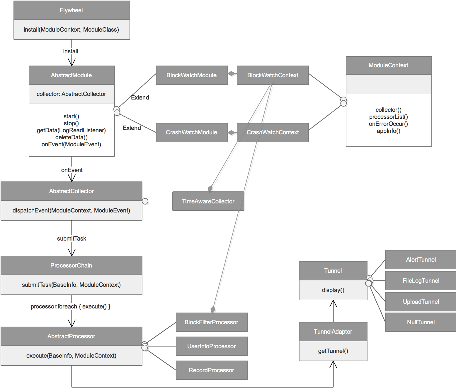 ExceptionCollector是向用户提供的异常信息或者自定义日志信息收集接口。开发者可以将Catch住的异常信息通过这个接口提交到Flywheel,以享受到后续的去重、分类、过滤、存储等统一处理流程。