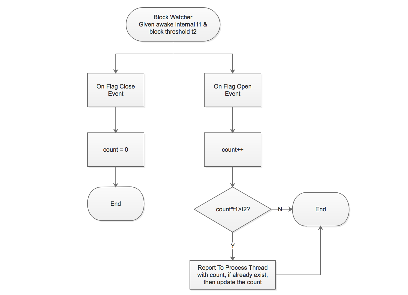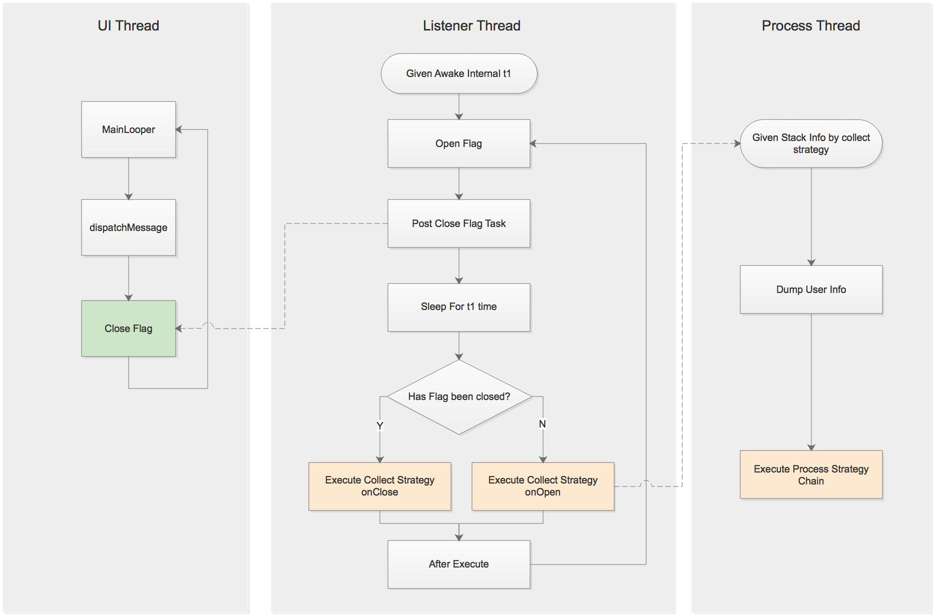 的方案无法得知卡顿持续了多久,Flywheel提供了一种策略来解决这个问题:多次唤醒+次数记录。策略的大致流程图如下:通过这种策略,我们可以将卡顿划分各个时长区间,比如1-2秒,2-3秒,3-5秒,5秒以上,这种分类可以帮助我们更好的确定问题的严重性与优先级。