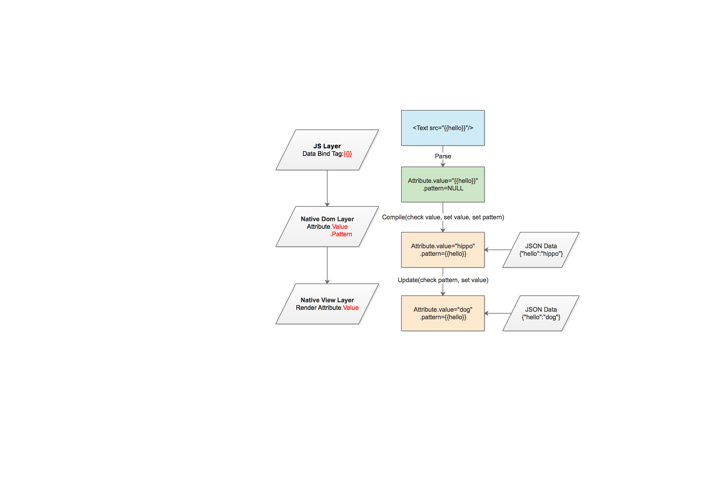 Mint采用类似于Angular的数据绑定方案,使用``标签实现数据绑定,但是对于标签的解析放于Native端处理,实现更优的性能。