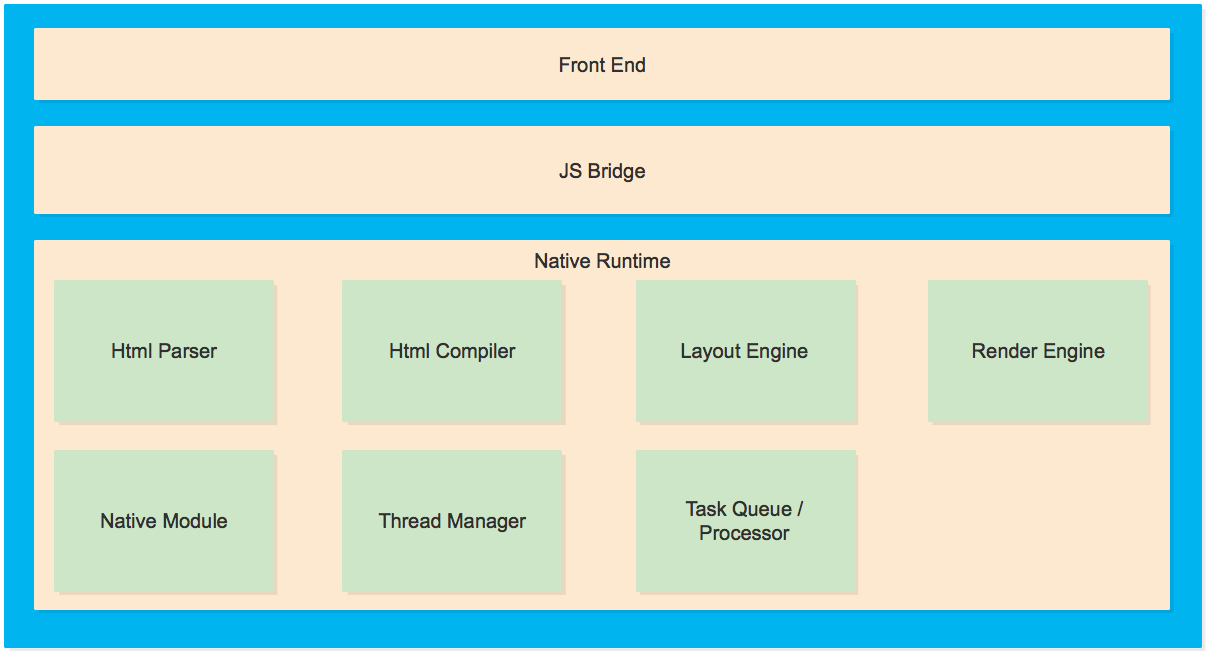 Mint包括 Front End、JS Bridge、Native Runtime三部分。其中Front End提供了前端开发框架,处理Java层数据、接口的封装与解析。JS Bridge负责JS与Native的通信。Native Runtime负责模板解析、编译、渲染、以及Native端能力的提供。总体架构图如下所示: