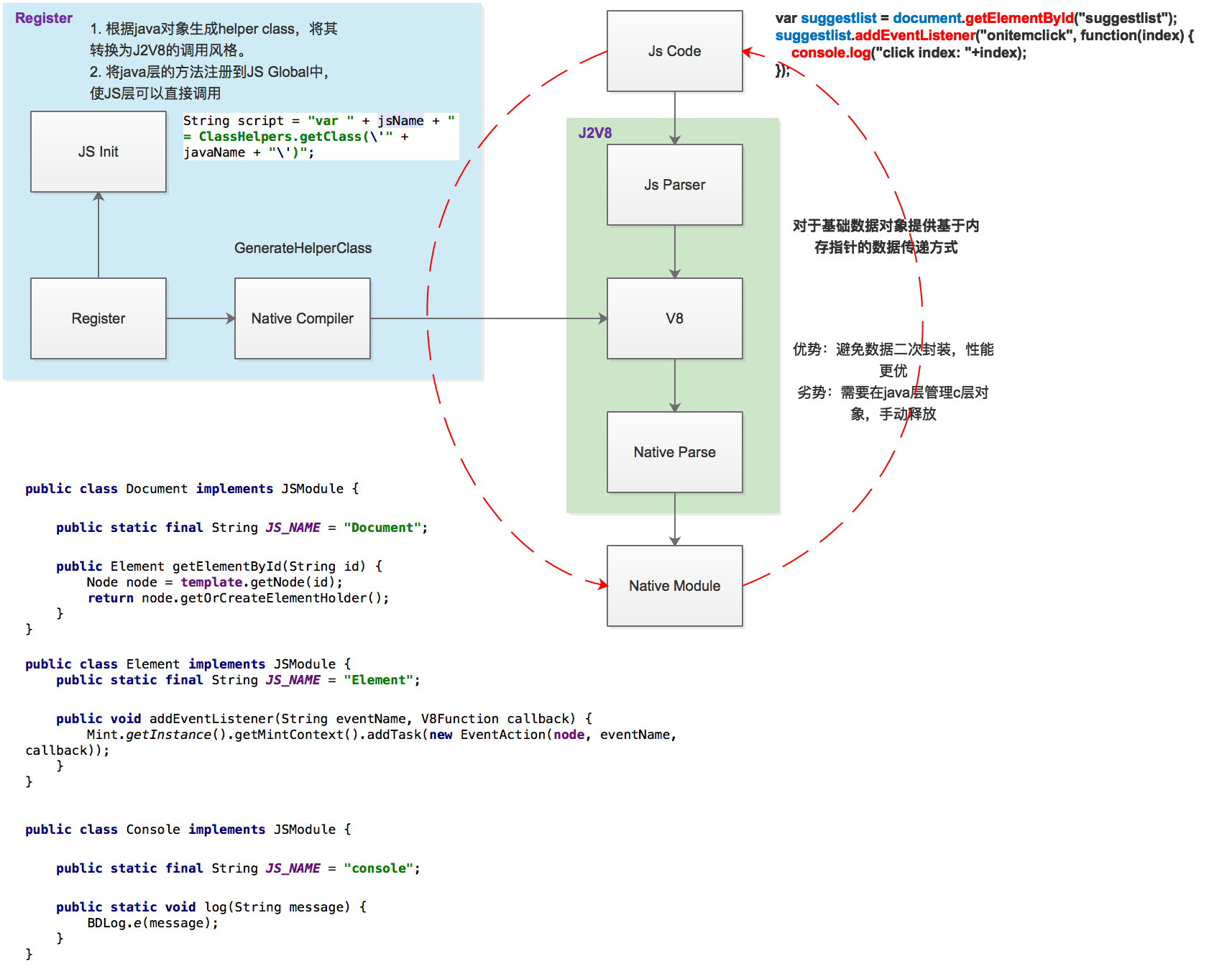 Mint基于V8引擎与J2V8封装提供了JS层与Native层的无缝调用技术,实现了在JS层可以任意访问Native的对象与接口。其技术框架如下: